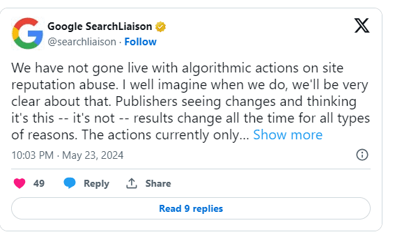 “We have not gone live with algorithmic actions on site reputation abuse. I well imagine when we do, we’ll be very clear about that. Publishers seeing changes and thinking it’s this — it’s not — results change all the time for all types of reasons.”